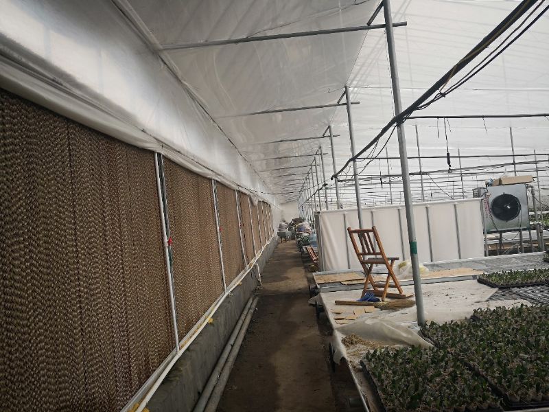 该系统是,目前北方地区夏季使用比较多、比较有效节能的一种降温方式。风机通过向外排风,将室内的湿热空气排到室外,棚内形成负压室外的空气经过水帘的水幕降温后进入室内达到降温的效果。